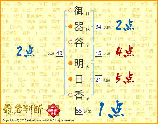 御(11画)器(16画)谷(7画) 明(8画)日(4画)香(9画)