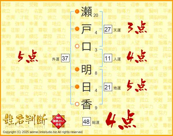 瀬(20画)戸(4画)口(3画) 明(8画)日(4画)香(9画)