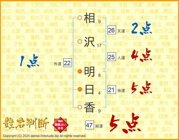 相(9画)沢(17画) 明(8画)日(4画)香(9画)