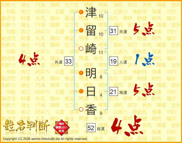 津留崎明日香さんの総運は52画の4点!