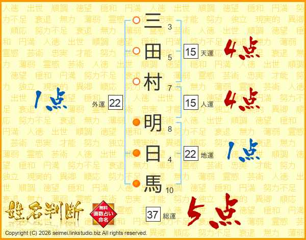 三(3画)田(5画)村(7画) 明(8画)日(4画)馬(10画)
