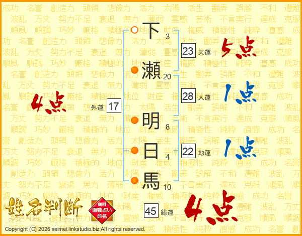 下(3画)瀬(20画) 明(8画)日(4画)馬(10画)