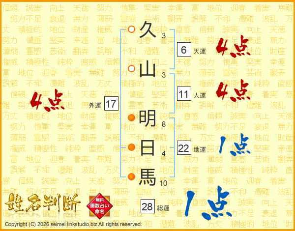 久(3画)山(3画) 明(8画)日(4画)馬(10画)