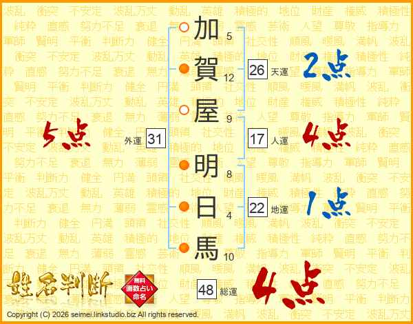 加(5画)賀(12画)屋(9画) 明(8画)日(4画)馬(10画)