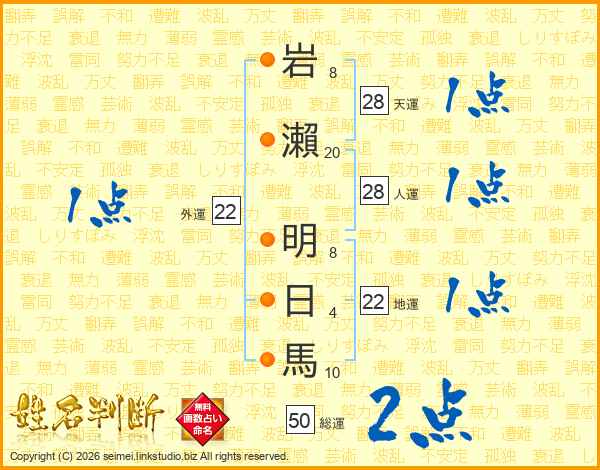 岩(8画)瀨(20画) 明(8画)日(4画)馬(10画)