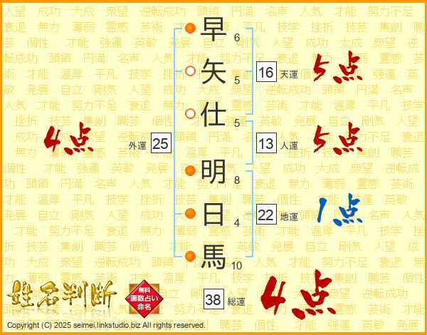 生活面を象徴する運勢です。外部から受ける影響力を表し、結婚運、家庭運や職場、環境への順応性を表します。総運から人運を引いた画数。姓や名が1文字の場合を除く。