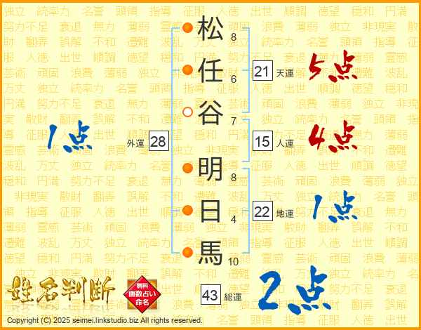 松(8画)任(6画)谷(7画) 明(8画)日(4画)馬(10画)