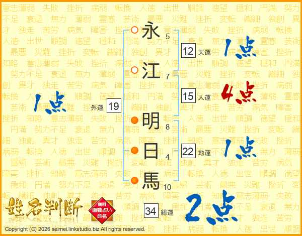 永(5画)江(7画) 明(8画)日(4画)馬(10画)