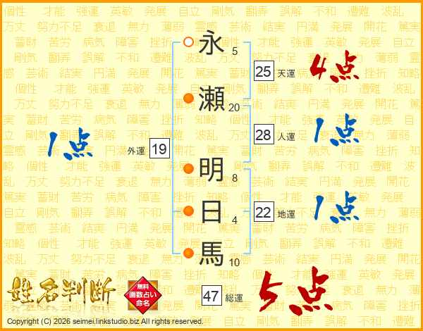 永(5画)瀬(20画) 明(8画)日(4画)馬(10画)