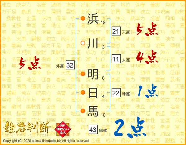 浜川明日馬さんの外運は32画の5点!