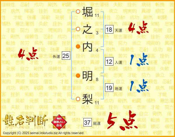 堀(11画)之(3画)内(4画) 明(8画)梨(11画)