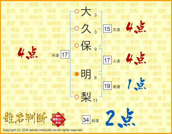 大久保明梨さんの総運は34画の2点!