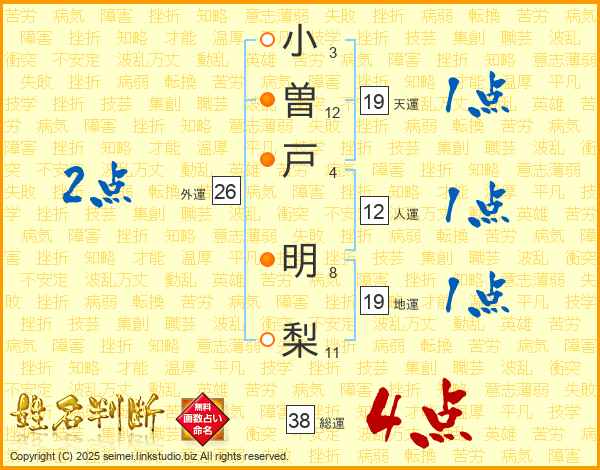 小(3画)曽(12画)戸(4画) 明(8画)梨(11画)