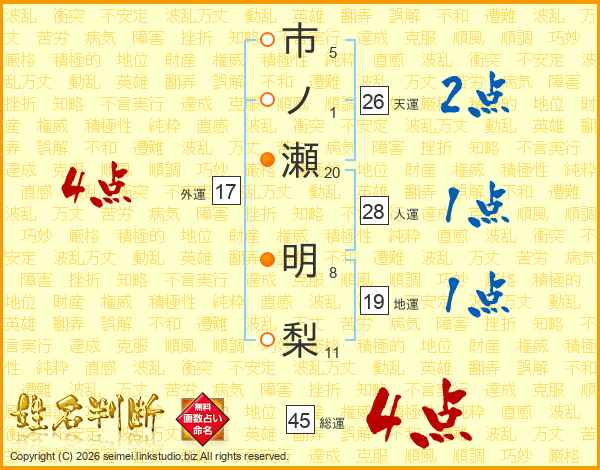 市(5画)ノ(1画)瀬(20画) 明(8画)梨(11画)