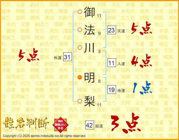 御(11画)法(9画)川(3画) 明(8画)梨(11画)