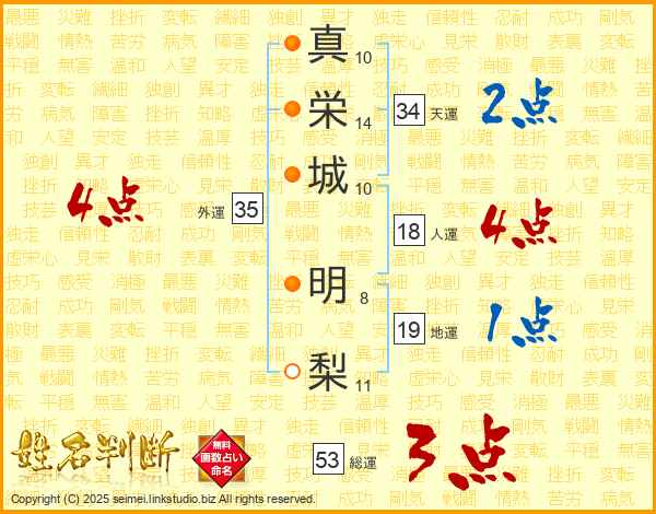 真(10画)栄(14画)城(10画) 明(8画)梨(11画)