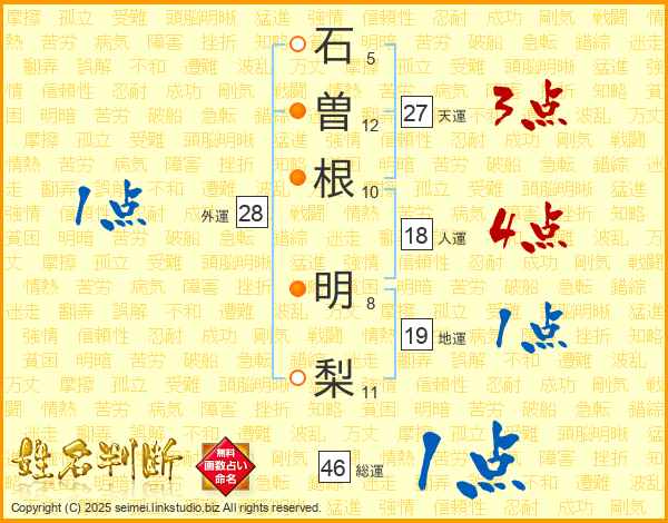 石(5画)曽(12画)根(10画) 明(8画)梨(11画)