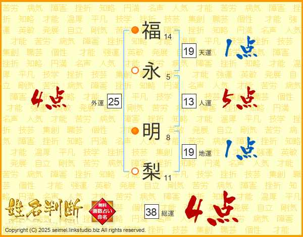 生活面を象徴する運勢です。外部から受ける影響力を表し、結婚運、家庭運や職場、環境への順応性を表します。総運から人運を引いた画数。姓や名が1文字の場合を除く。