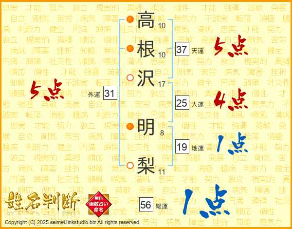 高(10画)根(10画)沢(17画) 明(8画)梨(11画)