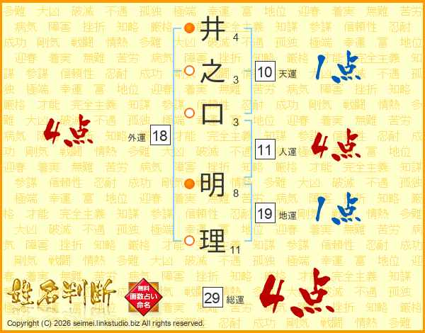 井(4画)之(3画)口(3画) 明(8画)理(11画)