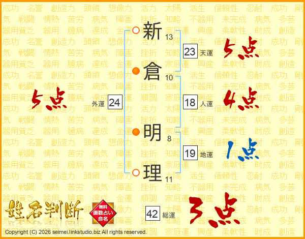 あなたの人生を表す1番重要な運勢です。生涯を通じて影響する総合運となり、主に50歳以降の晩年期に影響を及ぼします。苗字と名前の合計画数。