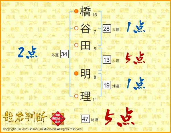 橋(16画)谷(7画)田(5画) 明(8画)理(11画)