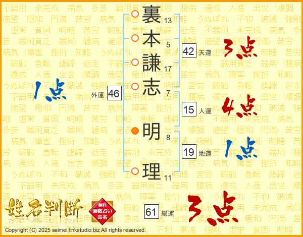 裏(13画)本(5画)謙(17画)志(7画) 明(8画)理(11画)
