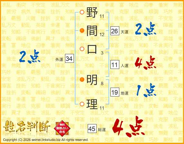 野間口明理さんの総運は45画の4点!