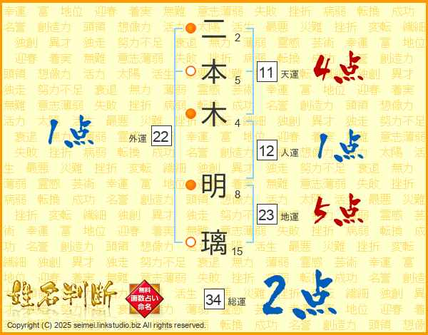 二本木明璃さんの総運は34画の2点!