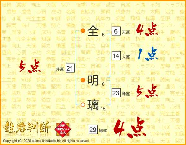 あなたの人生を表す1番重要な運勢です。生涯を通じて影響する総合運となり、主に50歳以降の晩年期に影響を及ぼします。苗字と名前の合計画数。