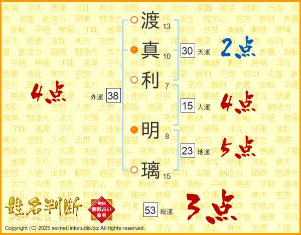 渡(13画)真(10画)利(7画) 明(8画)璃(15画)