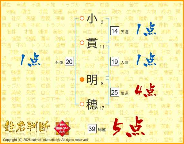 小(3画)貫(11画) 明(8画)穂(17画)