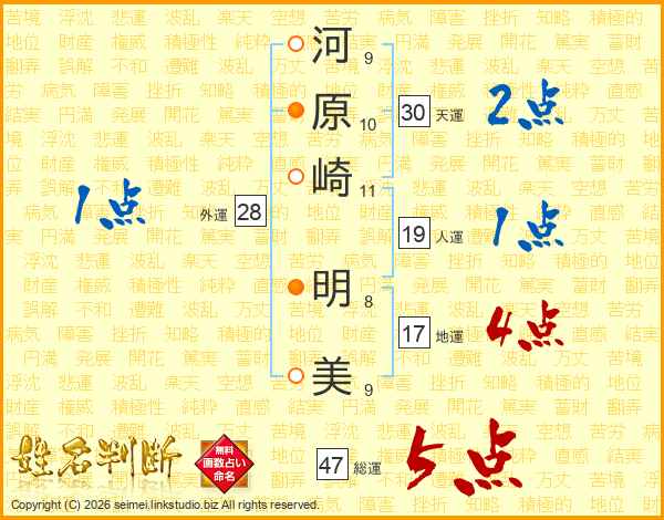 河(9画)原(10画)崎(11画) 明(8画)美(9画)