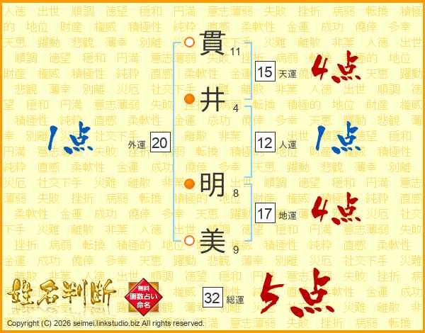 生活面を象徴する運勢です。外部から受ける影響力を表し、結婚運、家庭運や職場、環境への順応性を表します。総運から人運を引いた画数。姓や名が1文字の場合を除く。