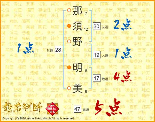那(7画)須(12画)野(11画) 明(8画)美(9画)