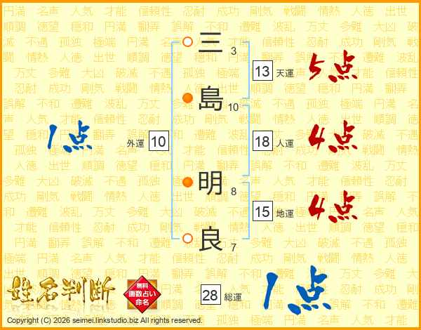 三(3画)島(10画) 明(8画)良(7画)