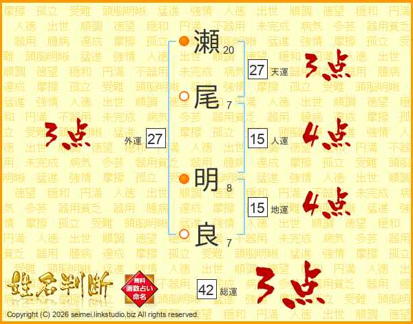 瀬尾明良さんの天運は27画の3点!