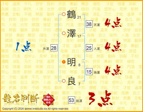 鶴(21画)澤(17画) 明(8画)良(7画)