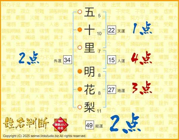 生活面を象徴する運勢です。外部から受ける影響力を表し、結婚運、家庭運や職場、環境への順応性を表します。総運から人運を引いた画数。姓や名が1文字の場合を除く。