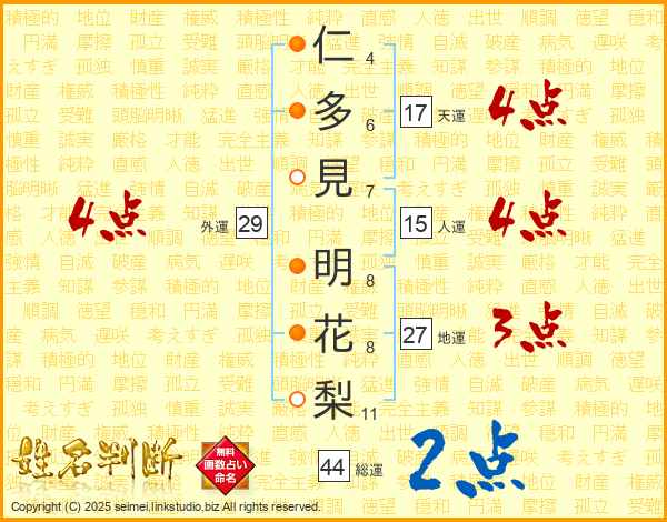 仁(4画)多(6画)見(7画) 明(8画)花(8画)梨(11画)