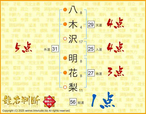八(8画)木(4画)沢(17画) 明(8画)花(8画)梨(11画)