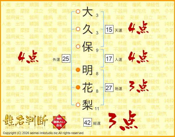 大(3画)久(3画)保(9画) 明(8画)花(8画)梨(11画)