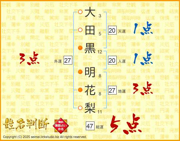 大(3画)田(5画)黒(12画) 明(8画)花(8画)梨(11画)