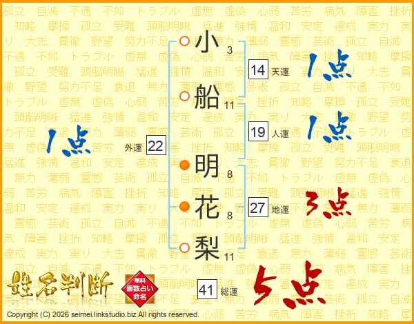 小(3画)船(11画) 明(8画)花(8画)梨(11画)