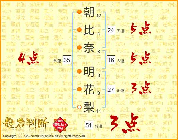 朝(12画)比(4画)奈(8画) 明(8画)花(8画)梨(11画)