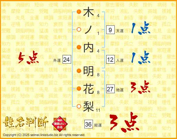 木(4画)ノ(1画)内(4画) 明(8画)花(8画)梨(11画)