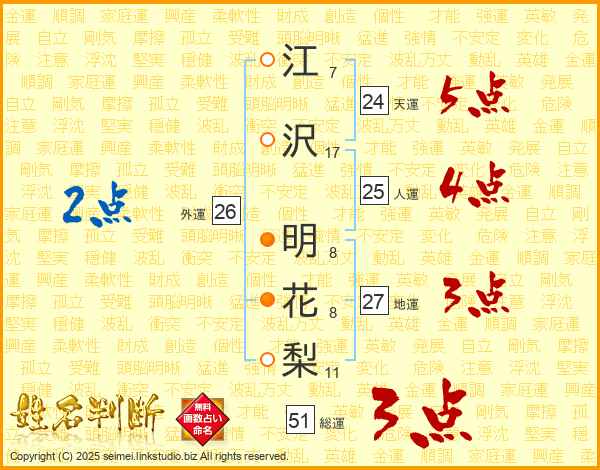 江(7画)沢(17画) 明(8画)花(8画)梨(11画)