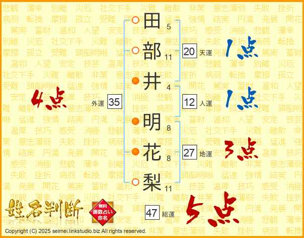 田(5画)部(11画)井(4画) 明(8画)花(8画)梨(11画)