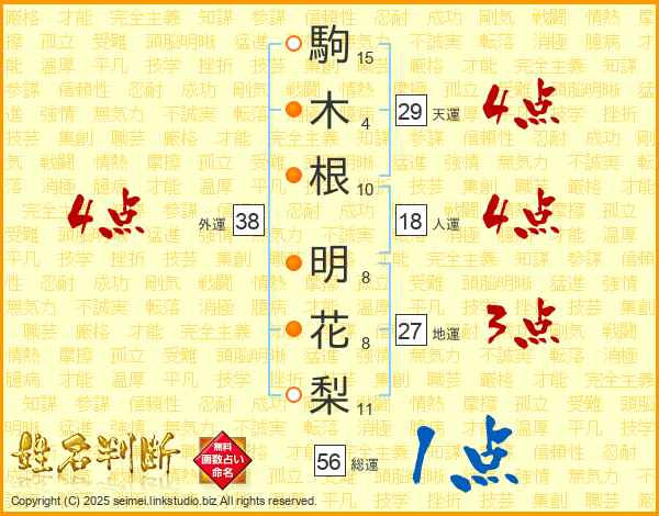 駒(15画)木(4画)根(10画) 明(8画)花(8画)梨(11画)