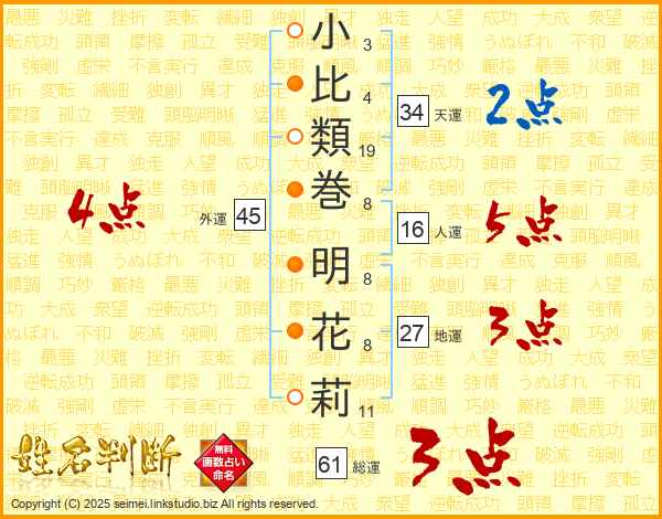 小(3画)比(4画)類(19画)巻(8画) 明(8画)花(8画)莉(11画)